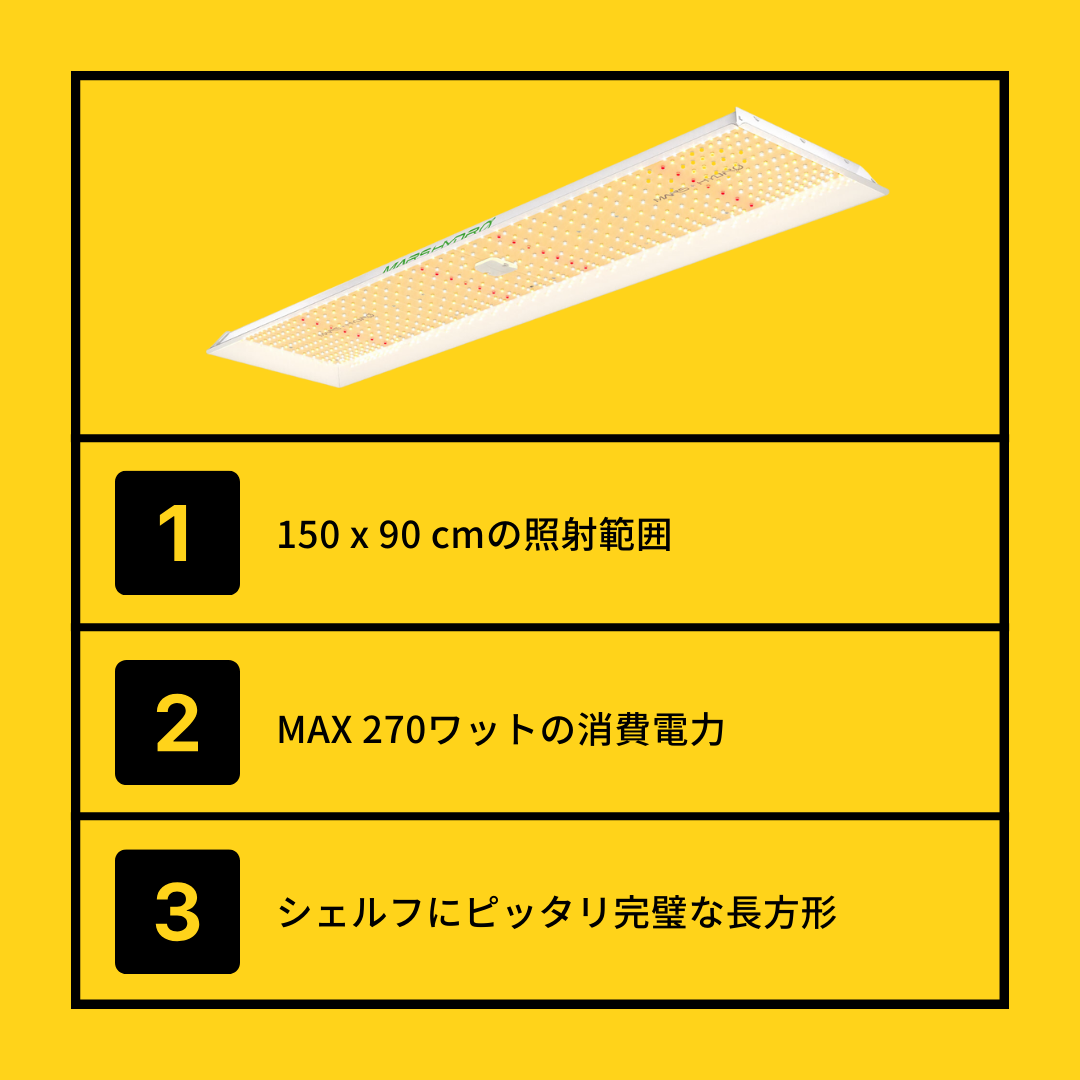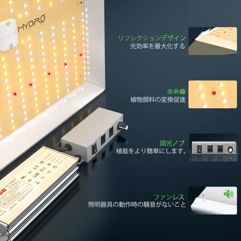 フルスペクトルLEDライト: 400-700nmの波長帯の光を組み合わせた独自のスペクトラを使用しています。より大きな芽を生産するために必要なIR(730-740nm)も含まれています。