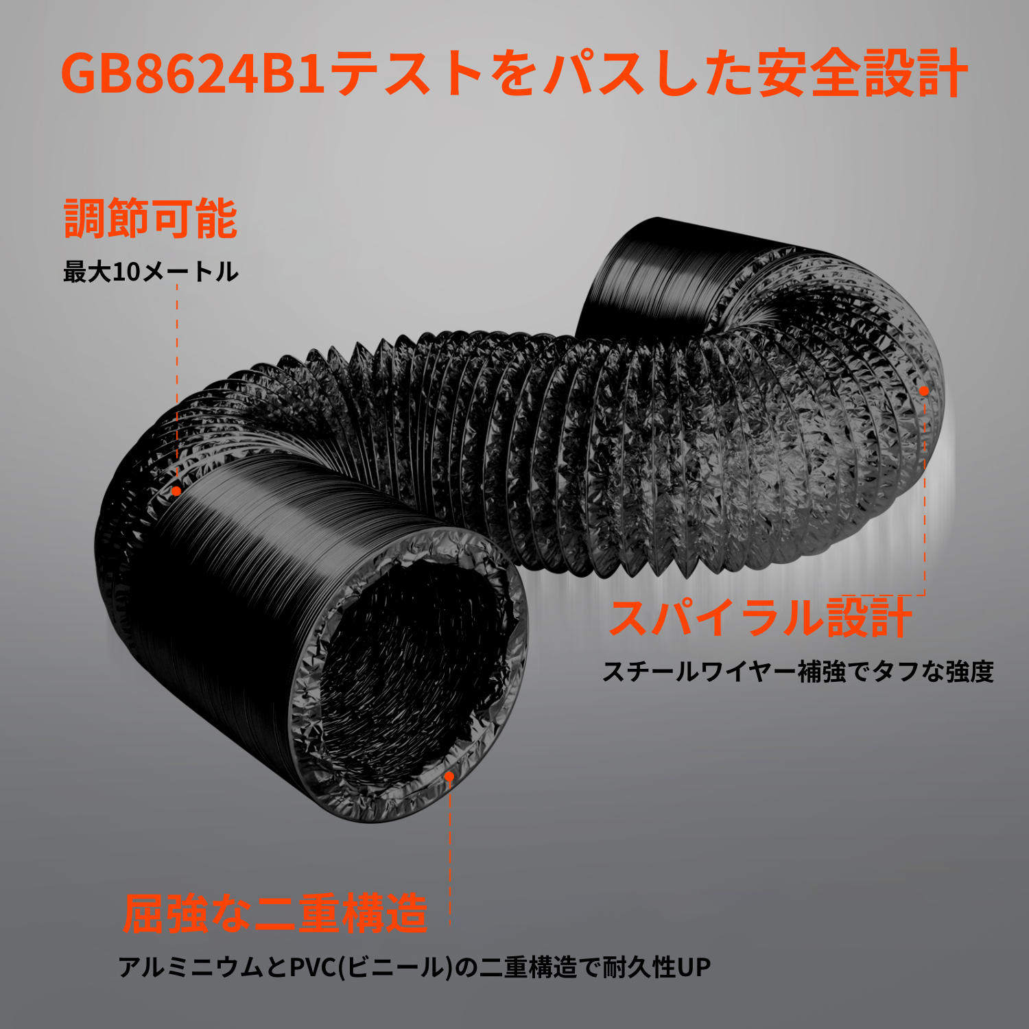 - 【フレキシブルダクト】ダクトは高品質のアルミニウムとPVCで作られており、スチールワイヤーを内蔵し、耐久性を確保します。全長10メートルまで伸縮可能で、GB8624B1燃焼試験に合格し、安全に使用できます。調整可能なクランプはステンレススチール製、丈夫で高耐久性です。