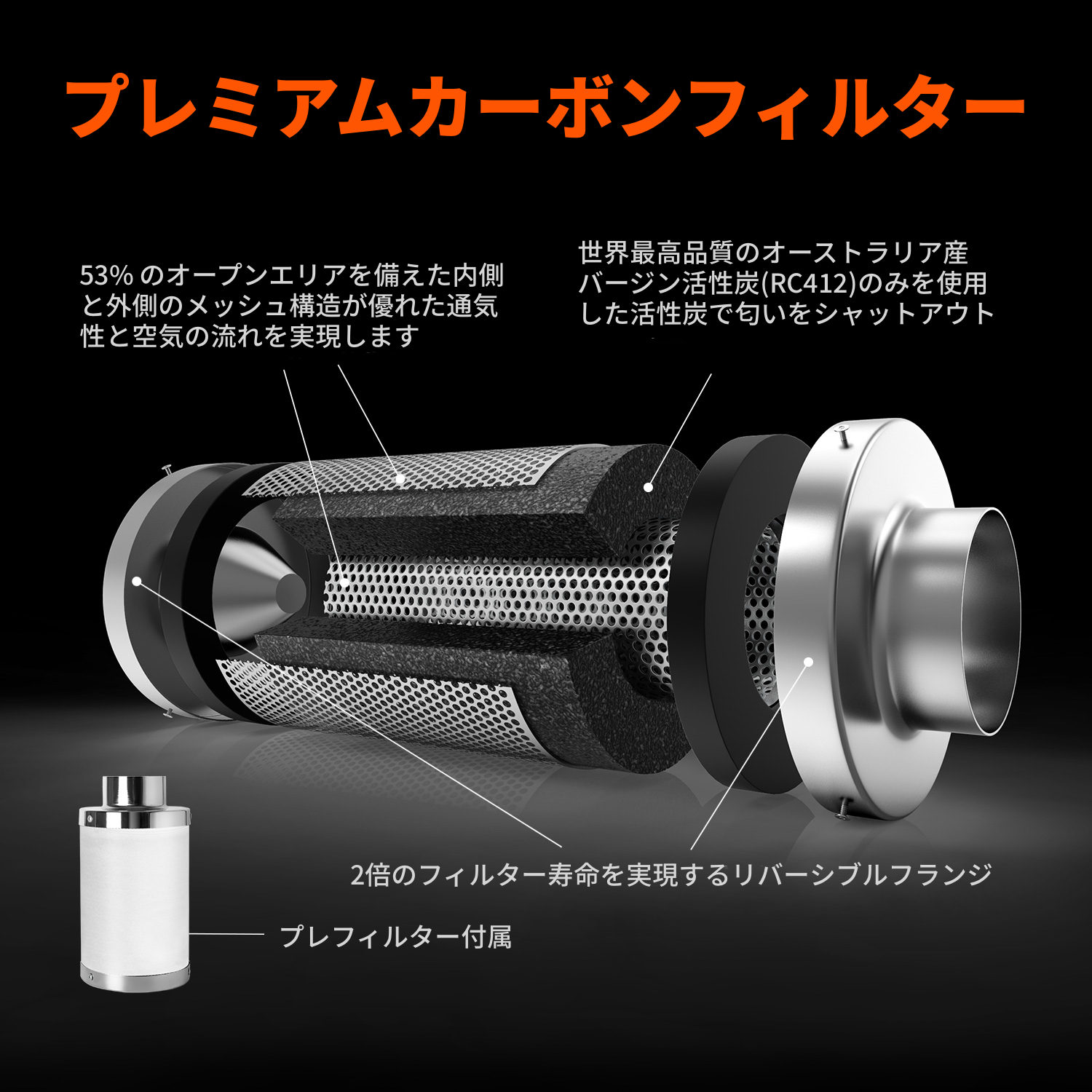 - 【高性能カーボンフィルター】RC412活性炭を使用し、耐久性の高い金属フィルターハウジングとステンレススチールフランジで構成され、38mmの厚さのカーボン層でより多くの吸収を実現しています。大きな粒子を捕捉し、フィルターの寿命を延ばすためのプレフィルタが付属しています。