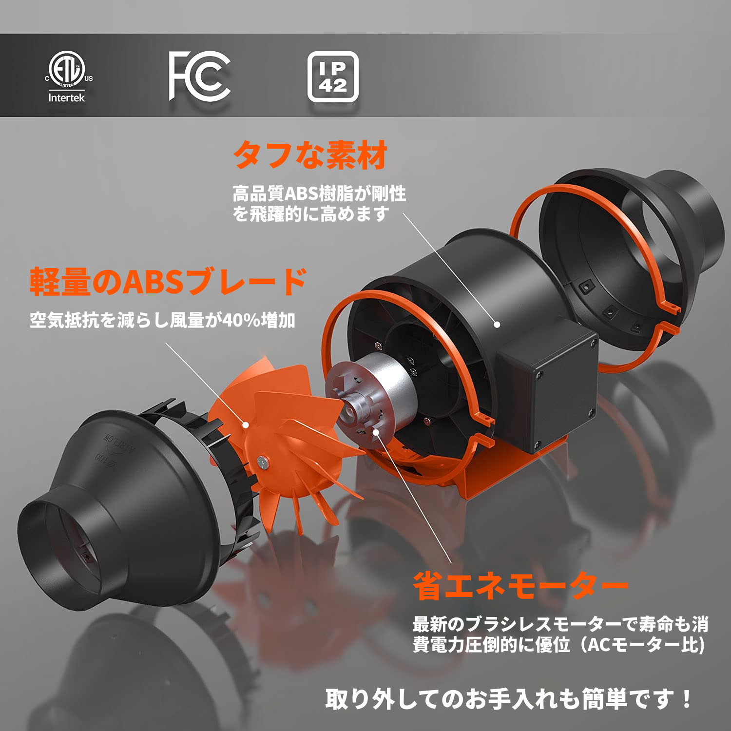 - 【プログラマブルインラインファン】わずか30ワットの消費電力で205 CFMの風量を発生し、28DBの低騒音レベルで、静かです。軽量のABSブレードは風量抵抗を減らし、風量を40%増加させます。スマートコントローラには、作動モードが複数あり、10段階の速度があり、湿度と温度を自動制御します。