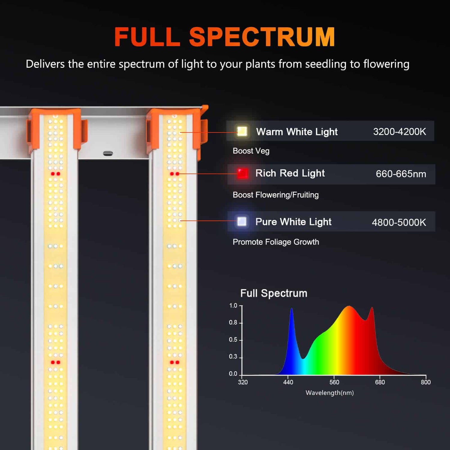- 最適化されたフルスペクトル: 植物の成長の全ステージ(種まきから収穫まで)に適したフルスペクトル(3200-4200K、4800-5000K、 660-665nm)を採用しています。