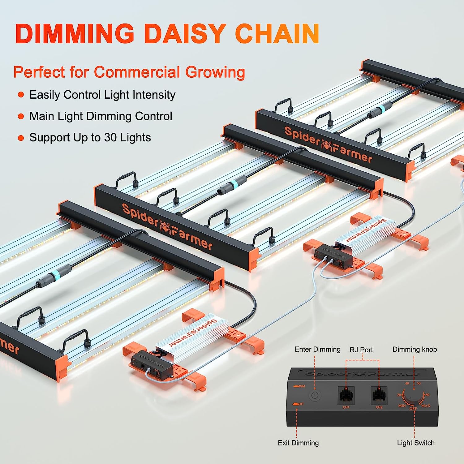 - デイジーチェーン調光: 最大30台のSE3000を連結して、複数のライトの明るさを同時に調整可能。商業栽培、ホームグロウ、ハイドロポニクスに広く応用されます。
